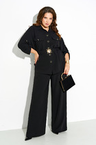 Комплект состоит из джемпера и брюк выполнен из трикотажного полотна оранжевого цвета. Характеристики: джемпер укороченный, V образный вырез горловины, застежка центральная на петли пуговички, пуговички выполнены в виде сердец, рукав втачной. Длина по спинке 42 см, длина рукава 70 см. Брюки прямого кроя , пояс брюк на резинке на подгибе. Длина 111 см.