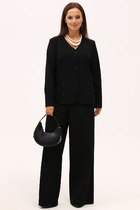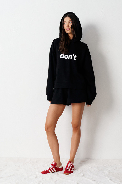 Комплект состоит из джемпера и шорт выполнен из хлопкового полотна черного цвета. Характеристики: джемпер прямой крой, капюшон, по передней части изделия контрастная акцентная надпись don t . Рукав свободного кроя - спущен. Длина по спинке 53 см, длина рукава от края горловины 79 см. Шорты прямого кроя, пояс шорт на резинке со сборкой, в боковых швах карманы. Дина 35 см.