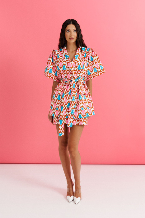 Комплект состоит из жакета и шорт выполнен из ткани с абстрактным принтом. Характеристики: Жжакет прямого кроя, подкладка, отложной воротник, застежка центральная на петли пуговицы, рукав втачной объемный , по линии талии нашиты шлевки, в комплекте пояс из ткани основного изделия, по переду крупные функциональные карманы с клапаном. Длина по спинке 71 см, длина рукава 32. Шорты прямого кроя, пояс стабильный, застежка пуговичка молния, в боковых швах карманы. Длина 43 см.