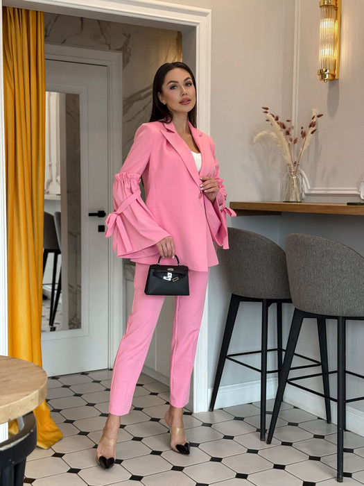 Костюм 2-хпредметный.  Жакет  однобортный свободнго силуэта. Жакет обработан подкладкой. Рукав прямой, длинный, втачной, отрезной с пришитой присборенной деталью, шнурком из основной ткани для завязывания.  Брюки прямого кроя, длинна 7/8, застёжка- гульфик , по боковым швам обработаны карманы