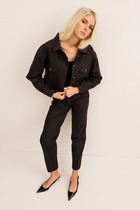 Костюм 2-хпредметный. Жакет приталенного силуэта, обработан подкладкой. Отрезной по линии талии, декорирован пришитым поясом по линии талии. Низ изделия обработан баской, собранной в складку. Рукав длинный, вачной. Окат рукава обработан вставкой для удлиннения плечевого шва. Перед жакета обработан сборкой. Брюки прямого кроя, длинна 7/8, застёжка- гульфик , по боковым швам обработаны карманы