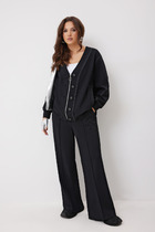 Этот 3-х предметный комплект состоит из жакета, корсетного топа и брюк.    Жакет - настоящая жечужина в гардеробе.  Небанальный вариант застёжки сбоку на лицевой стороне, и потайной пуговицей внутри  изделия придаёт жакету характер, подчёркивает силуэт и линию талии. Жакет выгодно акцентирует фигуру, создавая утончённый и женственный образ. Благодаря декоративным рюшам из вуали, он легко станет центральным элементом образа. Карманы с клапанами.    Корсетный топ с открытыми плечами — воплощение чувственной элегантности. Открытые плечи подчеркивают линию шеи и ключиц, а корсетный крой создает безупречный силуэт. Роскошный силуэт и акцентная баска делают его идеальным выбором для особенного вечера. Также топ отлично вписывается в повседневные образы.  Брюки станут глотком свежего воздуха среди широких силуэтов и брюк палаццо. Их облегающий крой подчёркивает линию бедёр и тали, а затем изящно расклешается от колена.Такой фасон позволит скорректировать фигуру и подойдёт для строго дресс кода. Вертикальные линии по центру брючин вытягивают силуэт и удлиняют ноги. Застёжка классическая - молния и пуговица в цвет изделия.