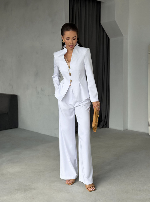 Этот 2-х предметный комплект состоит из жакета и брюк.                                                                                   Жакет. Нежный утонченный жакет выполнен из плотной костюмной ткани, обработан подкладкой. Приталенный крой мягко облегает фигуру, а изящные подплечники добавляют образу уверенности и грации, напоминая о классических образах французского кинематографа. Складки, создающие рельеф баски, мягко ложатся на бедра за счет своей геометрии. Рукава прямые втачные, одношовные.                                 Брюки.  Широкие брюки в классическом белом цвете сочетают в себе элегантность и удобство и станут эффектной деталью базового гардероба. Свободный крой не сковыает движений, а завышенная талия подчеркнут фигуру. Складки добавляют образу элегантность. Застёжка  на потайные  кнопки без лишнего визуального шума.