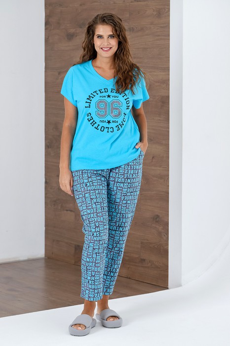 Костюм женский из трикотажного полотна «кулирка» в комбинации двух видов в единой цветовой гамме: гладкокрашеного и с набивным рисунком, состоящий из футболки и брюк.