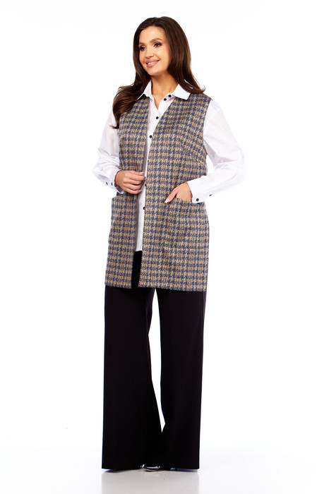 Комплект женский, состоит из жилета, блузки и брюк. Жилет прямого силуэта с v-образным вырезом горловины, без застежки, по переду накладные карманы, спинка значительно короче переда, разрезики по боковым швам. Блузка классическая, с рубашечным воротником на стойке, с втачным рубашечным рукавом с манжетой по низу, застежка спереди на планку с пуговицами, по боковым швам закругленные разрезы. Брюки прямые широкие, на поясе-кокетке, с застежкой спереди на молнию и пуговицы, с боковыми карманами со скосом по передним половинкам брюк.