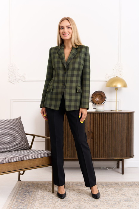 Комплнект женский, состоящий из жакета и брюк. Жакет прилегающего силуэта с вертикальными рельефами от проймы по переду и спинке, с отложным воротником, с застёжкой спереди на петли и пуговицы, рукав вточной 2-х шовный со шлицей, по переду карманы с клапаном. Изделие на подкладке. Брюки прямые, зауженные к низу, на поясе-кокетке с застёжкой спереди на молнию и пуговицу, с боковыми карманами, со стрелками и шлёвками.