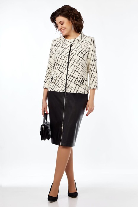 Комплект женский состоит из блузы,выполненной из трикотажного полотна с оригинальным дизайном и юбки, выполненной из экокожи на вискозной основе.