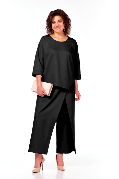 Женский нарядный двухпредметный костюм состоит из блузы и брюк с имитацией юбки спереди,выполнен из плательно-костюмной однотонной ткани с блестящим напылением.