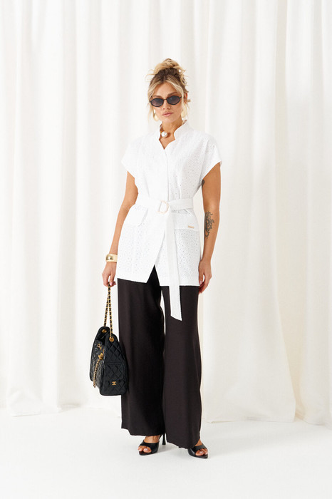 Яркий акцентный комплект - идеальный пример сочетания комфорта и стиля, а также протест привычным деталям. Брюки из льняной ткани с жакетом из шитья деликатно подчеркнут нежную женственность и динамичную дерзость в едином образе.