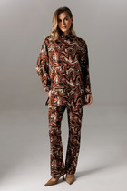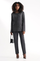 Комплект 2-х предметный состоит из жакета и брюк. Жакет женский удлиненный, полуприлегающего силуэта с центральной бортовой застежкой на пуговицы до линии перегиба лацкана. Спереди рельефные швы от плечевого шва, отрезной бочок и карман с клапаном. Спинка с рельефами от плечевого шва. Рукав втачной, двухшовный. Воротник пиджачного типа. Жакет на подкладке. Длина рукава 61,5 см, длина по спинке 70 см. Классические брюки, прямые, слегка заужены к низу, по переду обработаны карманы с отрезным бочком, застежка на тесьму-молнию и 1 пуговицу. На задних половинках обработаны вытачки и имитация карманов в рамку с двумя обтачками, пояс в брюках притачной. По низу брюк в боковом шве есть небольшой разрез. Длина брюк от талии по боковому шву 97 см