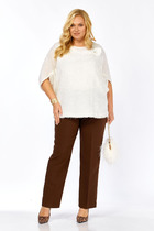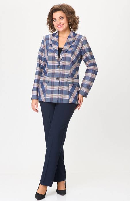 Комплект женский-двойка, из текстильной ткани, жакет удлиненный, полуприлегающего силуэта с центральной бортовой застежкой на пуговицы до линии перегиба лацкана. Спереди рельефные швы от плечевого шва, отрезной бочок и карман с клапаном. Спинка с рельефами от плечевого шва. Рукав втачной, двухшовный. Воротник пиджачного типа. Жакет на подкладке, длина по спинке 67 см, длина рукава 62 см. Брюки прямые, классические, с заутюженными стрелками, по переду обработаны карманы с отрезным бочком, застежка на тесьму-молнию и 1 пуговицу. На задних половинках обработаны вытачки и имитация карманов с листочкой, пояс в брюках притачной, сбоку на резинке. Длина брюк от талии по боковому шву 103 см.