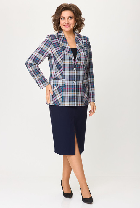 Комплект женский-двойка, из текстильной ткани, жакет удлиненный, полуприлегающего силуэта с центральной бортовой застежкой на пуговицы до линии перегиба лацкана. Спереди рельефные швы от плечевого шва, отрезной бочок и карман с клапаном. Спинка с рельефами от плечевого шва. Рукав втачной, двухшовный. Воротник пиджачного типа. Жакет на подкладке, длина по спинке 67 см, длина рукава 62 см.Юбка прямого силуэта, с небольшой кокеткой в верхней части, которая обработана обтачкой, спереди обработан разрез-шлица. Заднее полотнище со средним швом и талиевыми вытачками, застегивается на потайную молнию. Длина по боковому шву 74 см. Юбка на подкладке.