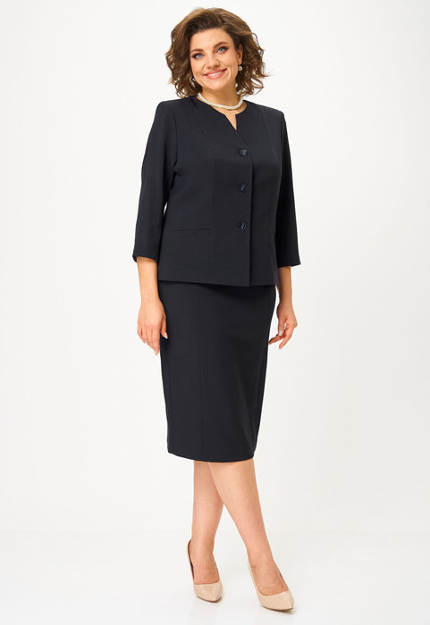 Женский комплект 2-х предметный состоит из жакета и юбки. Жакет классический,с  V-образным вырезом, полуприлегающего силуэта с центральной бортовой застежкой на петли-пуговицы. Спереди рельефные швы от плечевого шва,отрезной бочок и карман с втачной листочкой. Спинка с рельефами от плечевого шва. Рукав втачной, двухшовный, укороченный, с небольшим разрезом в локтевом шве. Перед жакета на подкладке. Длина рукава 48 см, длина жакета по спинке 59 см. Юбка прямого силуэта, верхний срез юбки обработан обтачкой, заднее полотнище со средним швом, застегивается на потайную молнию. Шов переходит к низу в шлицу. Юбка по переднему и заднему полотнищу с кокеткой и вертикальными рельефами, швы отстрочены в цвет юбки. Длина по боковому шву 70 см. Юбка на подкладке.