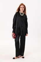 Комплект 2-х предметный состоит из жакета и брюк. Двубортный жакет, свободного кроя, на подкладке. По переду имеется отрезной бочок и вертикальные вытачки. С прорезными карманами с клапаном и двумя обтачками. Спинка цельная. Воротник пиджачного типа. Рукав двухшовный, по низу рукава обработана шлица на петли-пуговицы. Длина рукава 63 см, длина по спинке 74 см. Классические брюки, прямые, слегка заужены к низу,заутюжены стрелки,по переду обработаны карманы с отрезным бочком,застежка на тесьму-молнию и 1 пуговицу. На задних половинках обработаны вытачки и имитация карманов в рамку с двумя обтачками, пояс в брюках притачной. По низу брюк в боковом шве есть небольшой разрез. Длина брюк от талии по боковому шву 94 см.