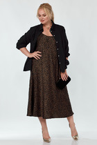 Комплект 2-х предметный состоит из жакета и и брюк. Двубортный жакет, свободного кроя, на подкладке. По переду имеется отрезной бочок и вертикальные вытачки. С прорезными карманами с клапаном и двумя обтачками. Спинка цельная. Воротник пиджачного типа. Рукав двухшовный, по низу рукава обработана шлица на петли-пуговицы. Длина рукава 63 см, длина по спинке 74 см.  Брюки прямые, классические, с заутюженными стрелками, по переду обработаны карманы с отрезным бочком, застежка на тесьму-молнию и 1 пуговицу. На задних половинках обработаны вытачки и имитация карманов с листочкой, пояс в брюках притачной, по боковому на резинке.  Длина брюк от талии по боковому шву 103 см.