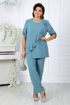 Женский комплект 2-х предметный, состоит из жакета и брюк из текстильной ткани. Жакет двубортный, свободного кроя, на подкладке. По переду имеется отрезной бочок и вертикальные вытачки. С прорезными карманами с клапаном и двумя обтачками. Спинка со средним швом. Воротник пиджачного типа. Рукав двухшовный, втачной. Длина рукава 63 см, длина по спинке 74 см. Брюки классические, прямые, заутюжены стрелки, по переду обработаны карманы с отрезным бочком, застежка на тесьму-молнию и 1 пуговицу. На задних половинках обработаны вытачки и имитация карманов с листочкой, пояс в брюках притачной, без резинки. Длина по боковому 102 см.