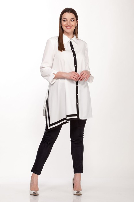 Комплект женский двухпредметный состоит из блузки и брюк. Блузка асимметричная выполнена из тонкой блузочной  ткани, свободного силуэта с одной стороны по полочке расширенная к низу, в боковых швах разрезы, воротник на стойке,планка втачная, застежка на петли и пуговицы. Рукав втачной 3/4  с притачным манжетом с разрезом. Длина изделия 80 см, рукава- 50 см. Брюки (легинсы) прилегающего силуэта,выполнены из эко-замши с добавлением эластана с декоративными подрезами, спинка  украшена нефункциональной листочкой, пояс на резинке. Длина изделия-103 см.