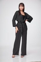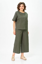 Костюм женский двух предметный свободного силуэта. Состоит из куртки ветровки и брюк. Куртка выполнена из хлопковой ткани без подкладки с накладными карманами на полочке и кулиской на талии. Рукав втачной с притачным манжетом на резинке по низу. Застежка молния. Брюки с высокой посадкой полуприлегающего силуэта. Пояс на резинке. В боковых швах карманы с листочкой. Длина брюк 100 см.