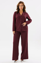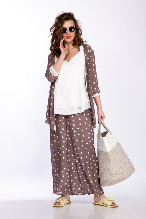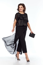 Комплект женский трехпредметный, состоит из кардигана, блузона и кюлот. Кардиган без застежки, рукав втачной 3/4 с притачным довязом. Длина кардигана 83 см. Блузон двухслойный без рукава на широких брителях. Кюлоты на резинке с карманами в боковых швах и на подкладке. Длина кюлот 100см.