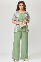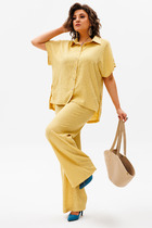 Костюм женский свободного силуэта. Состоит из блузки и шорт. Выполнен из хлопковой ткани. Блузка с центрально-бортовой застежкой на петли и пуговицы, воротник втачной на стойке, одна из полочек выполнена из контрастной ткани и украшена карманом, в боковых швах разрезы, рукав короткий втачной. Шорты свободные, в боковых швах карманы, пояс на резинке.
