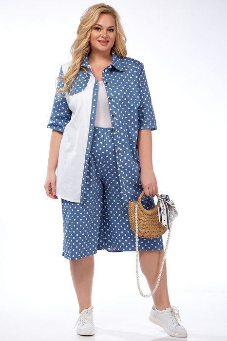 Костюм женский свободного силуэта. Состоит из блузки и шорт. Выполнен из хлопковой ткани. Блузка с центрально-бортовой застежкой на петли и пуговицы, воротник втачной на стойке, одна из полочек выполнена из контрастной ткани и украшена карманом, в боковых швах разрезы, рукав короткий  втачной. Шорты свободные, в боковых швах карманы, пояс на резинке.