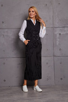 Костюм женский, двухпредметный, свободного силуэта, выполнен из трикотажной ткани. Состоит из джемпера и юбки. Джемпер с застежкой молния по центру, полочка украшена декоративными клапанпми, рукав втачной, длинный. Стойка, манжет рукава и низ джемпера выполнены из контрастной черной ткани. Длина джемпера по спинке 50см. Юбка А- силуэта с притачным поясом на резинке, с карманами. Длина юбки 70 см.