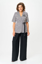 Костюм женский двухпредметный,свободного силуэта, состоит из блузки и брюк. Ткань шифон. Блузка с запахом и сборкой по переду выше уровня груди и с закругленными краями, рукав втачной 3/4 , низ рукава на резинке. Брюки с карманами в боковых швах и на трикотажной подкладке, пояс на резинке.