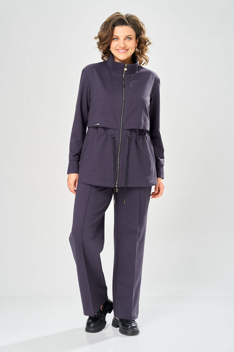 Жакет полуприлегающего силуэта с центральной застежкой на декоративную молнию, лиф с отлетными кокетками по переду и спинке. Горловина оформлена стойкой. По переду на уровне бедер прорезные карманы с листочкой. На линии талии настрочная кулиса с декоративным шнуром. Рукава втачные с манжетой по низу.