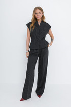 Брюки зауженные к низу с ассиметричным низом и разрезом в боковом шве. Застежка по линии банта на молнию. Верх брюк на поясе с резинкой по спинке.