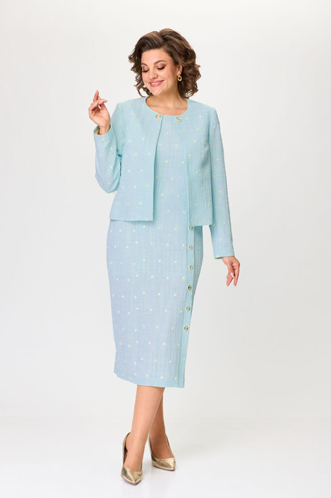 Платье прилегающего силуэта, горловина круглая, по переду рельефные швы, в левый рельеф вставлена планка с пуговицами, по низу разрез, по спинке центральный шов с застежкой молния.
