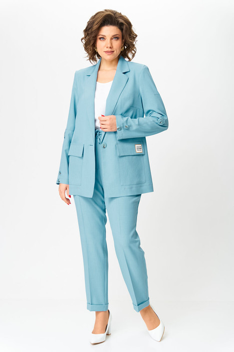 Жакет полуприлегающего силуэта, с центральной застежкой на одну пуговицу, борт с отворотом лацкана и воротником пиджачного типа. По переду накладные карманы с клапаном, рукава втачные с подрезом по линии локтя и патой для подхвата рукава на пуговицы. Жакет без подкладки. Все отделочные строчки на костюме выполнены контрастными нитками.
