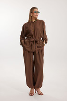 Брюки из однотонного трикотажа, по боковым швам лампасы с отделочным кантом, на уровне бедер карманы в боковых швах, верх брюк на поясе с резинкой.