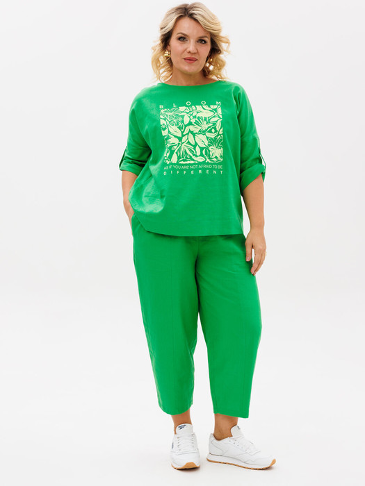 Комплект из льна: блузка прямого кроя. Рукав укороченный, до локтя с патой. По переду расположена дизайнерскя печать. С пинка лаконичная. Льняные брюки свободного кроя. Пояс выполнен на резинке с шнуром внутри, для удобства носки и регулирования облегания по талии. В боковых швах расположены карманы. По заднему полотнищу расположены накладные карманы.Это лучшие брюки для летнего сезона! Они подойдут для тех кто любит удобную и не сковывающую движения одежду.Эти брюки можно носить как на работу, так и мамам в декрете для прогулок, они отлично впишутся в гардероб для отпуска.Длина изделия 94 см.