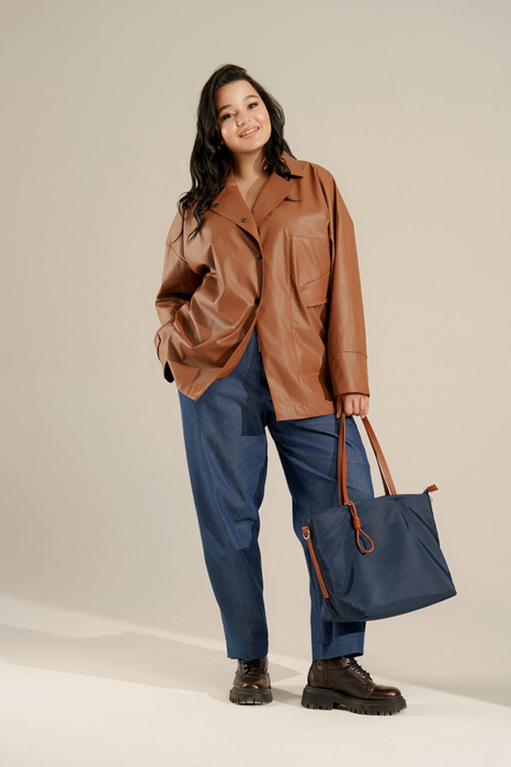 Комплект женский двухпредметный. Блуза из эко-кожи свободного покроя, застежка на кнопки. Воротник отложной. Рукав отрезной на базе цельнокроеного, по низу широкий отрезной манжет, справа с декоративным клапаном. Слева по переду в подрезе декоративный карман с клапаном.