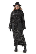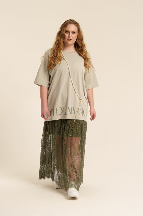 Комплект женский двухпредметный. Футболка из хлопкового трикотажного полотна объемной формы с дизайнерским принтом спереди. Вырез горловины- неглубокий округлой формы.  Длина джемпера по  спинке от линии горловины - 70 см., длина рукава от линии горловины - 43 см. Юбка прозрачная из гипюра в стиле бохо на подкладке. Пояс- с эластичной тесьмой без застежки. Ниже линии бедер выполнен подрез и волан с небольшой сборкой. Длина юбки по боковому шву с поясом - 99 см.