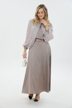 Комплект женский двухпредметный из смесовой ткани. Жакет свободного покроя. Вырез горловины - пиджачного типа фантазийной формы. Застежка - однобортная на петли с пуговицами. Рукава - втачные со спущенной линией плеча. Внизу рукавов - имитация шлиц с пуговицами. Спереди выполнены накладные карманы со складкой и клапаном. По низу изделия - отрезной пояс с мягкими складками для объема. Изделие посажено на подкладку. Юбка - зауженная к низу со шлицой на спинке. Пояс- отрезной с эластичной тесьмой и застежкой на петлю с пуговицей. в боковых швах имеются карманы с отрезными бочками. Юбка декорирована поясом в виде шнурка из основной ткани. Изделие посажено на подкладку.