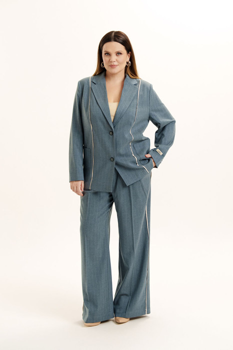 Комплект женский двухпредметный из смесовой ткани в полоску. Жакет прямого силуэта.  Вырез горловины оформлен воротником пиджачного типа. Застежка - двубортная на петли с пуговицами. Линия плеча слегка расширена и усилена плечевыми накладками. Рукава двухшовные. На передних половинках жакета имеются накладные карманы. Изделие декорировано кантами из ткани контрастного цвета. Жакет посажен на подкладку. Брюки - прямые со стрелками. Пояс- отрезной с эластичной тесьмой. Имеются карманы с отрезными бочками. В боковых швах - отделочные канты. Есть шлевки для ремня.