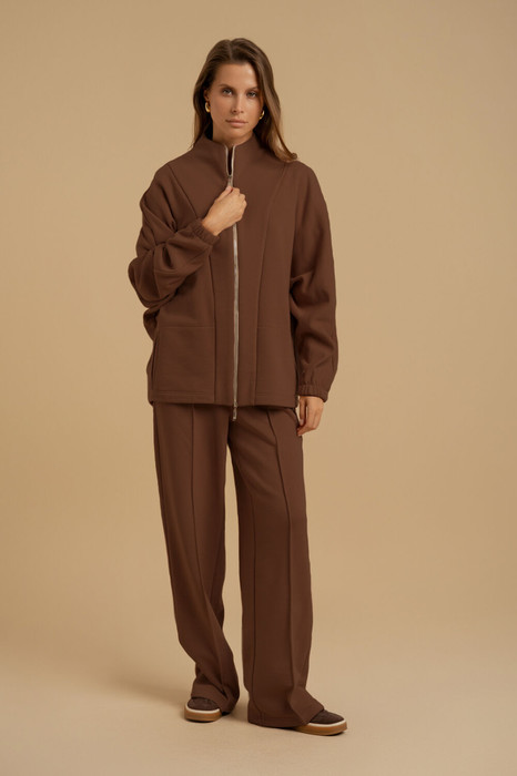 Комплект женский двухпредметный из трикотажного полотна футер. Джемпер свободной формы. Вырез горловины оформлен цельнокроеным воротником - стойкой.  Застежка - молния. Рукава - цельнокроеные  формы "летучая мышь". Спереди имеются прорезные карманы. Низ рукава с эластичной тесьмой. Брюки- свободного покроя. Пояс - отрезной  с эластичной тесьмой. В боковых швах имеются карманы. Спереди застрочены стрелки.