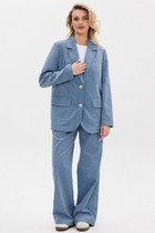 Костюм женский двухпредметный, жакет на подкладке. Жакет приталенного силуэта, с V-образной горловиной и рукавом фонариком на мажете. Жакет декорирован пуговицами. Брюки - прямые. Пояс - отрезной с застежкой на молнию и петлю с пуговицей и частично на резинке. Имеются карманы с отрезными бочками и шлевки для ремня. Низ брюк обработан закрытым швом. Отделочная фурнитура может меняться.