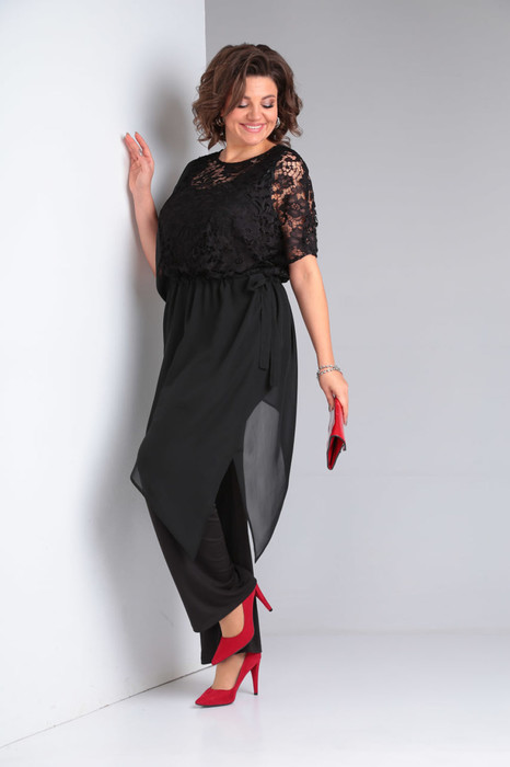 Комплект брючный состоит из брюк, майки и блузона. Брюки и майка выполнены из тонкого трикотажного полотна. Брюки широкие, с резинкой по талии. Майка с глубоким "о"-образным вырезом горловины и нагрудными вытачками. Блузон выполнен из прозрачного шифона и гипюра. Перед и спинка имеют ассиметричные подрезы: по правой стороне рельеф от которого в область талии подрез и кулиса. Блузон драппируется за счет пояса, который проходит через кулису.