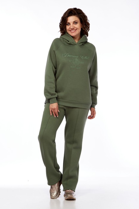 Комплект брючный( кофта+брюки). Кофта прямого силуэта с притачным манжетом из отделочной ткани. Рукав покроя реглан с притачным манжетом по низу. Капюшон. В качестве отделки используется вышивка на центральной части переда. Брюки прямые. Верхний срез обработан поясом с резинкой. В боковых швах обработаны карманы. На передних половинках застрочены стрелки.
