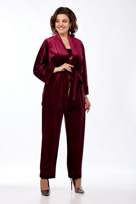 Комплект брючный состоит из жакета, майки и брюк. Жакет-кимоно свободного кроя без застежки. Рукав цельнокройный с притачным манжетом. Пояс съемный. Майка из отделочной ткани. Перед с пайетками, спинка из тонкого трикотина. Горловина округлой формы. Брюки свободного кроя, чуть заужены к низу. Передние половинки брюк с талиевыми вытачками . Задние половинки со складками и отстрочкой по гульфику. Пояс притачной на резинке.