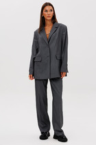 Комплект брючный состоит из блузы и брюк. Блуза полуприлегающего силуэта с центральной застежкой на петли и пуговицы. Линия плеча спущенная, воротник стояче-отложной с отрезной стойкой. По переду и спинке на линии талии -кулиса со шнуром. По боковым швам разрезы. Брюки прямые, верхний срез обработан поясом с резинкой. В бококвых швах карманы. В качсетве отделки используется шнур.