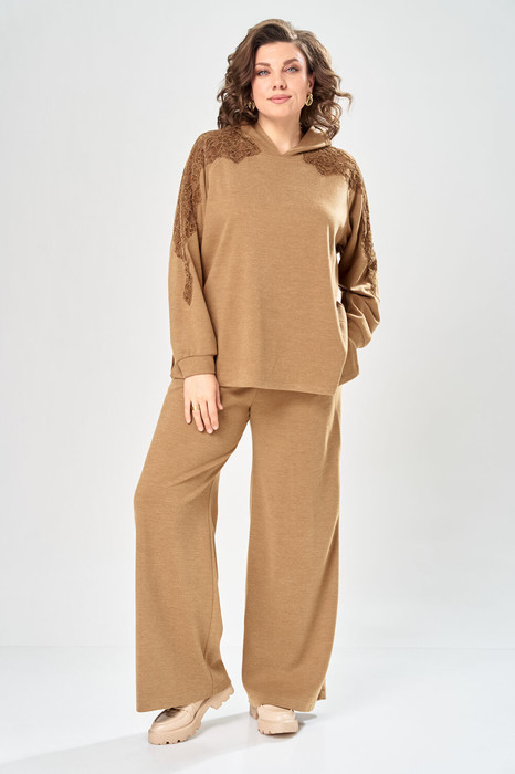Комплект брючный состоит из кофты и брюк. Кофта свободного кроя покроя реглан. По низу рукава манжет. Капюшон с центральным швом. По боковым швам разрезы. В качестве отделки используется кружево по рукаву и капюшону. Брюки широкие, в боковых швах обработаны карманы. Верхний срез обработан поясом с резинкой.