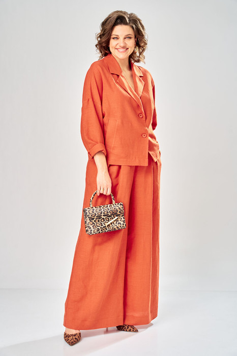 Комплект женский состоит из жакета и брюк. Жакет свободного кроя с застежкой на 2 петли и пуговицы. Перед с боковыми карманами "с листочкой". Рукав втачной, 2-шовный со спущенной линией плеча, спинка по низу частично на резинке. Воротник отложной с лацканами. Жакет без подкладки.Брюки широкие. Передние половинки брюк со складками внахлест, с боковыми карманами. Застежка спереди на молнию, передние половинки брюк с вытачками. Пояс по спинке на резинке.