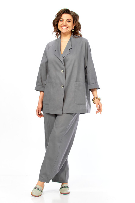 Комплект брючный свободного кроя состоит из жакета и брюк. Жакет прямого силуэта, с застежкой на 2 петли и пуговицы. Спинка с кокеткой, переходящей в рукав-реглан, перед с боковыми накладными карманами. Воротник стойка, переходящая в отворот с лацканами. На правом кармане декор-нашивка. Брюки "О"-образного силуэта с отрезными бочками. Задние половинки с кокеткой. Задние половинки брюк с застежкой "молния" и боковыми карманами в швах. Пояс частично на резинке со шлевками. Фурнитура может отличаться от заявленной на фото.