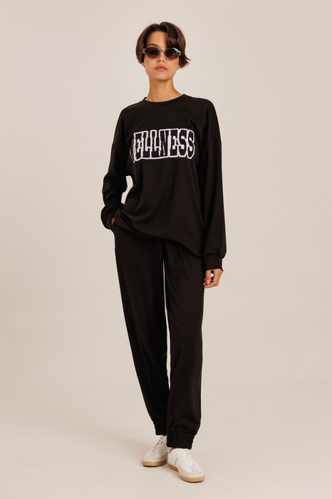 Костюм женский спортивный из трикотажного полотна. Джемпер широкий с вышивкой на полке. Плечо спущенное, рукав с притачной манжетой. Головина обработана бейкой, шов притачивания бейки по спинке обработан киперной тесьмой. Низ джемпера обработан притачной планкой. Брюки прямые с притачной манжетой и поясом с эластичной тесьмой внутри. В боковых швах обработаны карманы-хулиганы.