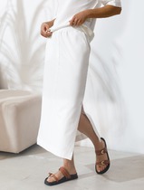 Костюм женский из трикотажа в спортивном стиле. Джемпер прямого силуэта с короткими спущенными рукавами. Горловина джемпера обработана притачной бейкой. По горловине спинки шов притачивания бейки обработан киперной тесьмой. Брюки прямого покроя "палаццо". Пояс стачной, на центральную часть пояса настрочена нашивка. По эластичной тесьме проложены 2 отделочные фиксирующие строчки. Низ джемпера, низ рукавов и низ брюк подшит на плоскошовной машине.