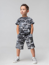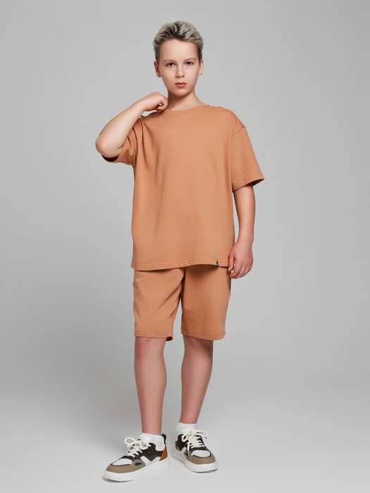Костюмдля мальчика из плотного гладкокрашеного трикотажного полотна "кулирка", состоящий из футболки и шорт. Футболка - свободного покроя, с удлиненными плечевым и швами, короткими втачными рукавами и горловиной овальной формы, обработанной втачной планкой. В нижней части переда слева настрочен декоративный элемент прямоугольной формы. По горловине проложена отделочная строчка. Шорты - классического покроя, на притачном поясе с эластичной тесьмой внутри и карманами в боковых швах. Для регулирования степени прилегания шорт по талии в пояс вставлен шнурок, продетый через две петли в центре пояса.