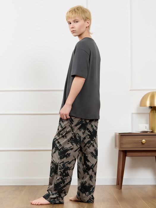 Костюм для мальчика, состоящий из футболки и брюк. Футболка однотонная с принтом на груди; модель свободная, со спущенной линией плеч, овальным вырезом горловины. Брюки из полотна с набивным рисунком эксклюзивного дизайна, прямые, с боковыми карманами с обтачными входами, на притачном поясе с отстроченной эластичной тесьмой.
